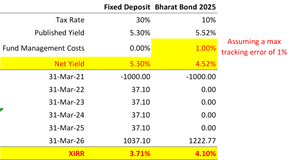 The current going rate of interest for a 4 year Fixed Deposit in the State Bank of India is 5.30%. The post-tax yield for an investor in the highest tax bracket for this Fixed Deposit comes to be 3.71%. The current Bharat Bond 2025 ETF/FoF yield as of 14-May-21 is 5.52%. Taking into account the Tracking Difference of ~1%, this yield has to be reduced to 4.52%. Further after applying the Long Term Capital Gains tax of 10%, the post-tax yield of the Bharat Bond 2025 ETF/FoF works out to be 4.10%- which is about 40 basis point (0.4%) higher than the Fixed Deposit. The table below provides details of our calculations: