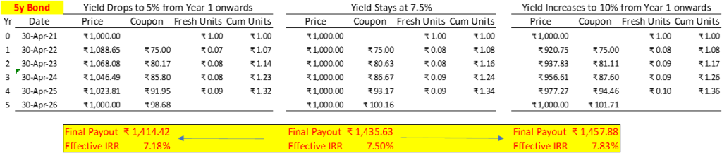 In the first table above, the 5y bond was expected to have a pay-out of Rs 1435.63/- after 5 years assuming yields remained at 7.5% throughout the 5 year term. In a scenario of yields dropping to 5%, the pay-out after 5 years would be Rs 1414.42/-. The IRR of the investment would then drop from 7.5% to 7.18%. This actually is a great outcome since we have achieved a yield of 7.18% versus a yield of 5.0% which existed for 4 of the 5 years of the life of the bond. On the other hand in a scenario of yields rising to 10%, the pay-out after 5 years would be Rs 1457.88/-. The IRR of investment would then increase from 7.5% to 7.83% – sub-par compared to the 10% yield that existed for 4 out of 5 years of the life of the bond – nevertheless still better than a comparable FD. Another way to look at this uncertainty is to say that the final pay-out will be in the range of Rs +/- 3% of Rs 1435.63 (the predicted pay-out based on the yield at the point of purchase). We would think a +/-3% uncertainty is acceptable – though this is open to interpretation.