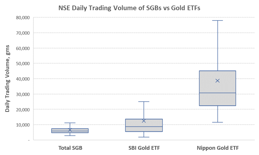 We have mentioned that SGBs are characterized by their low liquidity. We here try to establish how low this liquidity is as compared to the other more liquid form of holding gold such as the Gold ETF. As a first approximation we considered a window period from 1-Apr-21 to 31-Mar-22. In this period, we summed up the total volume of 49 SGBs traded on a daily basis. The daily trading volumes for the Nippon Gold ETF and SBI Gold ETF were also tabulated and converted to equivalent grams of gold. The data is presented as a box and whisker plot below.
