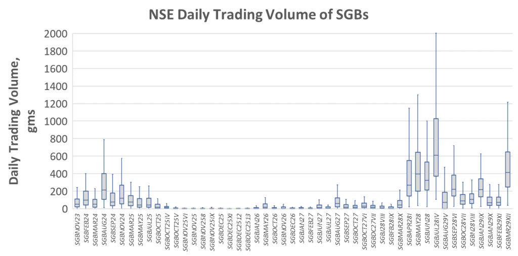 In the previous section we compared the total trading volume of all 49 SGBs versus two established Gold ETFs. It was established that SGBs as a family have low liquidity. However, do all SGBs have uniformly low liquidity ? or are there differences among them?. To understand this, we plot a box and whisker plot of daily trading volume of individual SGBs below: