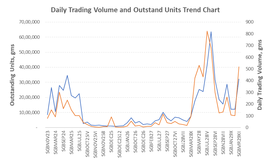 The blue line in the above chart (to be read off the primary y-axis of the left)is in near perfect consonance with the orange line which is daily trading volume (to be read off the the secondary y-axis on the right). The liquidity of an SGB in the secondary market is therefore primarily determined by the number of outstanding units. Outstanding units explain why the daily trading volumes of some specific SGBs is high and low for others.