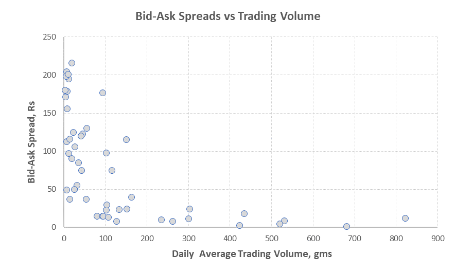 It is a known fact that low liquidity drives wider spreads between buyers and sellers in the market. Due to insufficient trading volumes, there are fewer buyer “bids” and also fewer seller “asks”. This creates gaps in expectations and invariably leads to a higher bid-ask spread. The scatter plot below plots the bid-ask spread (i.e the difference between the lowest ask and the highest bid) versus the average daily trading volume of SGBs. This is a snap shot of Bid-Ask spreads taken in a short window on 9-Mar-23.