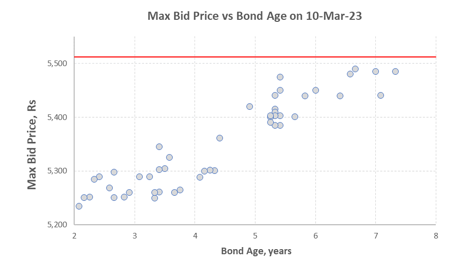 In the above scatter plot, the age of the bond has been calculated from the date of its issue to February 28th 2023.The Maximum Bid Price has been taken on 9th March,2023 and the price of 999 purity gold has been taken from the website of Indian Bullion and Jewellers Association (IBJA) as on 9th March 2023 which was ?5,512/gms. The above chart indicates that all SGBs trade at a discount to the price of 999 gold. The discount can be as high as about 300 Rs which is about 6% of the prevailing price of gold. It can also be seen from the above chart that as the age of bond increases the discount i.e., the difference between the price of gold and the maximum bid price decreases which means that the bonds closer to maturity, trade at the least discount to the price of gold. It is also interesting to note that around the bond age of 5 years a sudden increase in the bid price happens resulting in a drop in the discount. This is most likely because after reaching 5 years of age, SGB holders have the option to redeem the bond at the prevailing price of gold on specific dates which occur at 6 month intervals. As redemption of SGBs is a tax-free event, market participants are ready to bid higher for bonds which are close to or above 5 years of age.