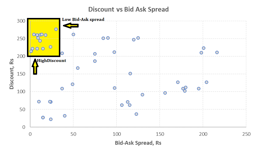 For an investor wishing to take a position in gold, the Sovereign Gold Bond is by far the superior investment vehicle. Please refer to this blog for a detailed discussion on this. The major drawback SGBs suffer from is their low liquidity. We have shown that SGBs with particularly low liquidity results in high bid-ask spreads – and these SGBs should definitely be avoided. On the other hand we have also shown that due to low liquidity in general SGBs trade at a discount to the prevailing price of 999 gold and this discount reduces as the SGB ages. The ideal combination for a prospective buyer would be an SGB trading at a hefty discount and simultaneously having a low bid-ask spread. This will combine the benefit of buying an SGB at a lower price than the published 999 gold price and also having the benefit of reasonable liquidity. The scatter chart below plots the discount rates of SGBs versus their bid-ask spreads.