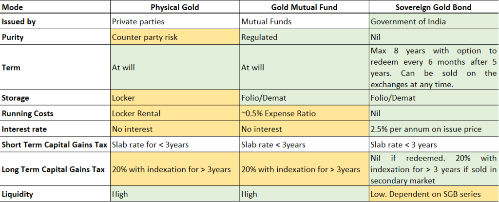 In a previous blog titled Sovereign Gold Bonds : 28-Feb-21, we have highlighted the key advantages of Sovereign Gold Bonds (SGB). We have argued that with the exception of secondary market liquidity, SGB is a superior form of holding gold. In the table below we present a summary of the primary modes of holding gold. We have ignored Digital Gold as it is not a regulated product and has significant counter party risk.
