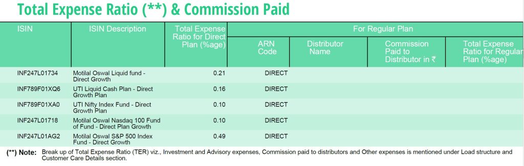 The table above indicates the absolute amount paid to the distributor during the half year period of interest. If you multiply these numbers by two you will get an indicative idea of how much you are paying your distributor annually. If you divide the amount you are paying your distributor annually by the total value of your mutual funds you will understand how much you are paying your distributor as a percentage of the funds that are invested. Do note that the commissions paid for Structured Products and Portfolio Managed Services is not reported here. Ofcourse commissions paid on insurance products is also NOT reported here. Nevertheless for mutual funds atleast you are now aware how much you are paying your mutual fund distribitor. As an exercise, I urge you to comb through your investments and establish how much commissions you are annually paying in total. Do this for your mutual funds (as discussed), your Insurance products, your Portfolio Managed Services and your Structured Products. Rationalizing commissions can save you a bundle. A similar commissions table is presented below, where all mutual funds are purchased in the DIRECT mode. You will note that no commissions are paid out and no distributor exists – all investments are DIRECT.