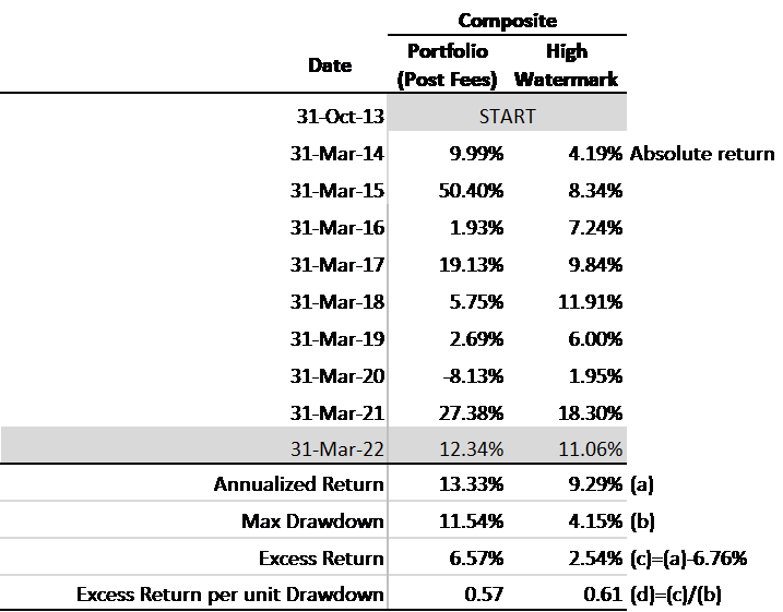 To avoid confusion, this time we are presenting only the composite portfolio performance vs the composite high-water mark. In the recent year ending 31-Mar-22, we have marginally outperformed the composite high-water mark by about 1.28% after fees. Since inception the outperformance on an annualized basis is about 4.04% (ie 13.33% – 9.29%). This may seem creditable. However, whenever measuring return, it is critical that we also measure risk. Our concept of risk is measured as maximum drawdown – which is the maximum drop in % terms the portfolio has suffered historically from the previous all-time high of the portfolio. The maximum drawdown suffered by the composite portfolio has been 11.54% vs 4.15% for the composite high-water mark. Clearly the composite portfolio is undertaking higher risk than the composite highwater mark. A fairer comparison would then be to normalize return for the risk undertaken. This normalized return we show in the last row of the table as the excess return per unit drawdown. The excess return per unit drawdown for both the composite portfolio (0.57) and the highwater mark (0.61) are similar, indicating that the excess return generated by the portfolio is very likely only because of higher risk undertaken and not because of manager out-performance. Presenting composite portfolio results as above, capture errors of commission. These errors manifest themselves in risk adjusted returns lower than the benchmarks set. In other words, Aroha has not made many errors of commission but could do a better job.
