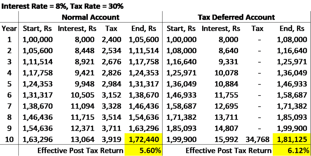 Imagine a fixed deposit of 1,00,000/- Rs earning 8% per year. The holder of this fixed deposit is in the 30% tax bracket. A tabulation of how this fixed deposit will grow over 10 years in a normal account versus a tax deferred account is shown in the table below: