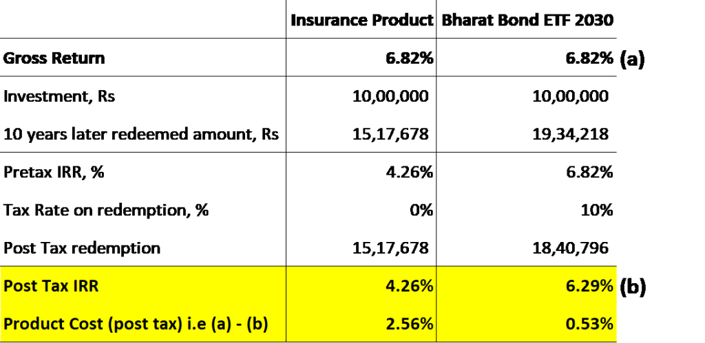 While tax deferral is a powerful tool to reduce tax incidence, Insurance companies market their products as investing products (rather than insurance products) stating their main benefit is proceeds of redemption is tax exempt under section 10(10D) of the IT act. Being tax exempt is likely to be better than being tax deferred – but this will be true only if the other costs associated with both the products are equal. I have mentioned in our earlier blog of 31-Jul-20, that invariably the cost of insurance products is such that the savings from being tax exempt is wiped out by the other costs of the insurance product – making the insurance product actually more expensive than similar mutual fund investments.. Two things are at play here – the first is the cost of the insurance product itself, and the other is the effective lower tax incidence due to tax deferral and lower tax rate at redemption of mutual fund products in the GROWTH mode. A table is given below to illustrate this idea. The numbers for the Insurance Product are plucked with some approximation from a proposal from an Indian insurer. The Gross Return for both the Insurance Product and the Mutual Fund Product (Bharat Bond ETF 2030) are assumed to be equal at 6.82%.